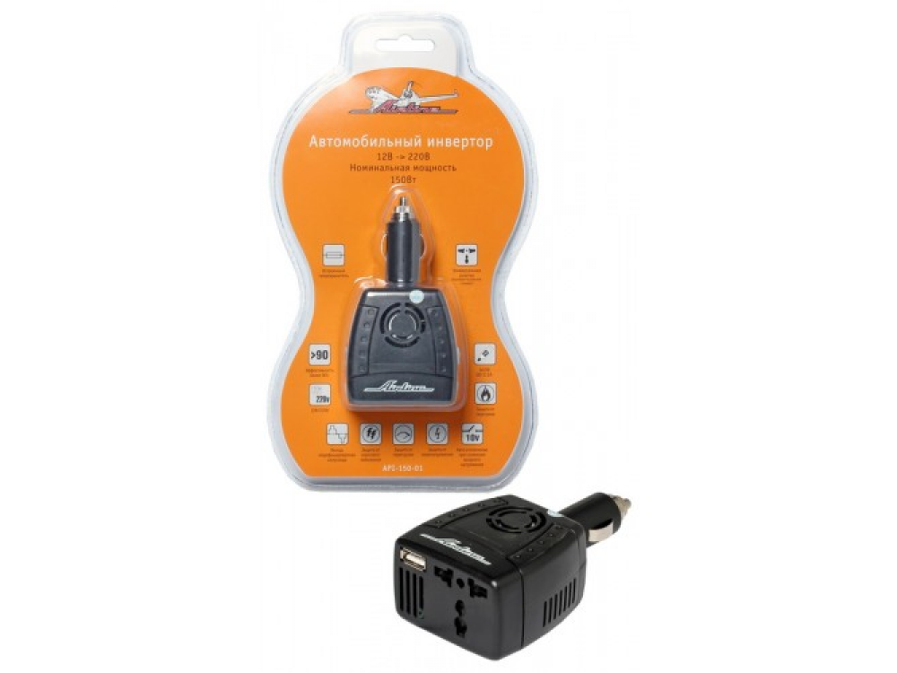 AIRLINE представляет самый компактный из серии преобразователь энергии с минимальной длительной мощностью. Инвертор делает доступным подключение изделий, для функционирования которых порог необходимой общей мощности составляет 150Вт. Корпус изделия изготовлен из прочного пластика, который позволяет устройству функционировать при широком диапазоне температур. Автомобильный преобразователь напряжения (инвертор) позволяет получить: -переменное напряжение 220В – 50Гц от штатного гнезда прикуривателя автомобиля с бортовой сетью 12В. Инвертор предназначен для питания устройств например: ноутбуков, видеокамер, DVD-плееров, зарядных устройств, электроинструментов, осветительных приборов и т.д.