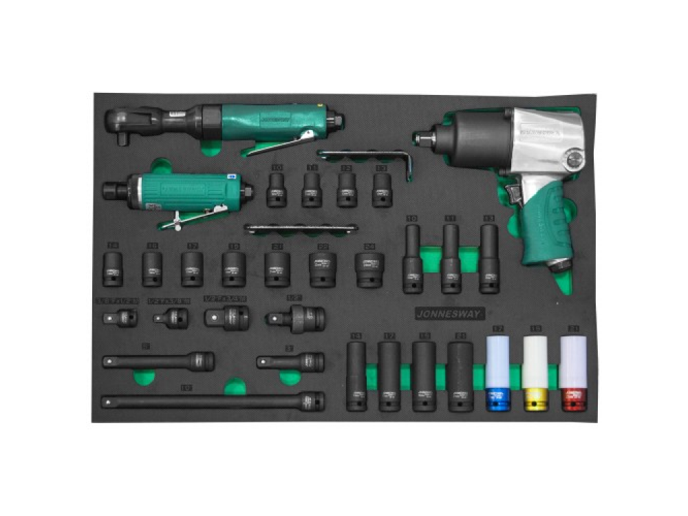 "СОДЕРЖАНИЕ:Гайковерт пневматический 1/2""DR 7000 об/мин. 780 Нм. JAI-1044Трещоточная рукоятка пневматическая 1/2""DR 170 об/мин. 100 Нм. JAR-6309AБормашинка пневматическая, патрон 6мм, 20000 об/мин, 143 л/мин. JAG-0906FMГоловки 1/2""DR торцевые ударные удлиненные тонкостенные для л/с дисков S03AD43S 3 предмета.17, 19, 21 мм.Головки 1/2""DR торцевые ударные, серии S03A4, 11 предметов.10,11,12,13,14,16,17,19,21,22,24 мм.Головки 1/2""DR торцевые, ударные, удлиненные, серии S03AD4, 7 предметов.10,11,13,14,17,19,21 мм.Адаптеры серии S03A, 3 предмета.3/8”Fx1/2”M, 1/2""Fx3/8”M, 1/2""Fx3/8M.Шарнир карданный 1/2""DR, ударный S03A4U.Удлинители ударные 1/2""DR, серии S03A, 3 предмета.75, 125, 250 мм."